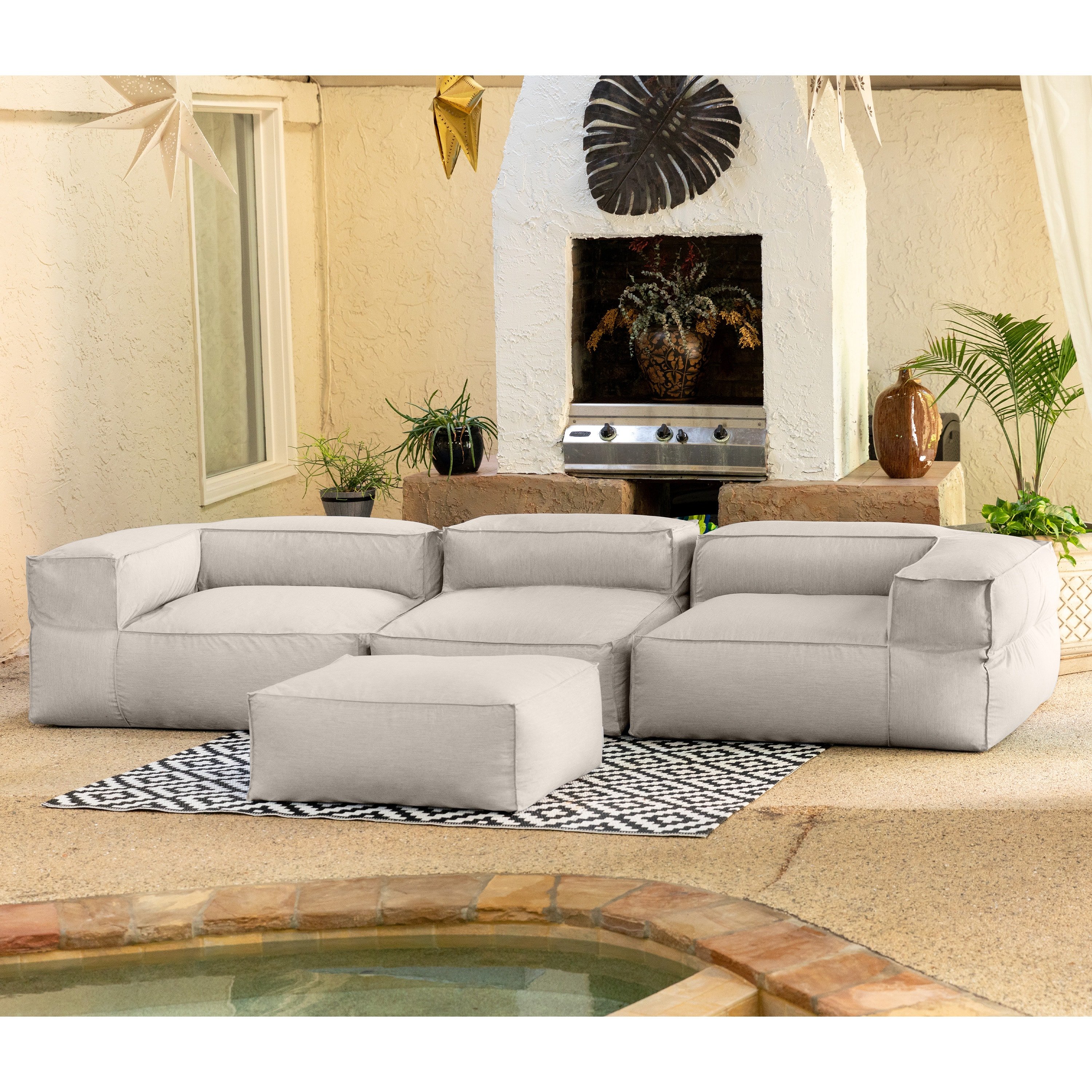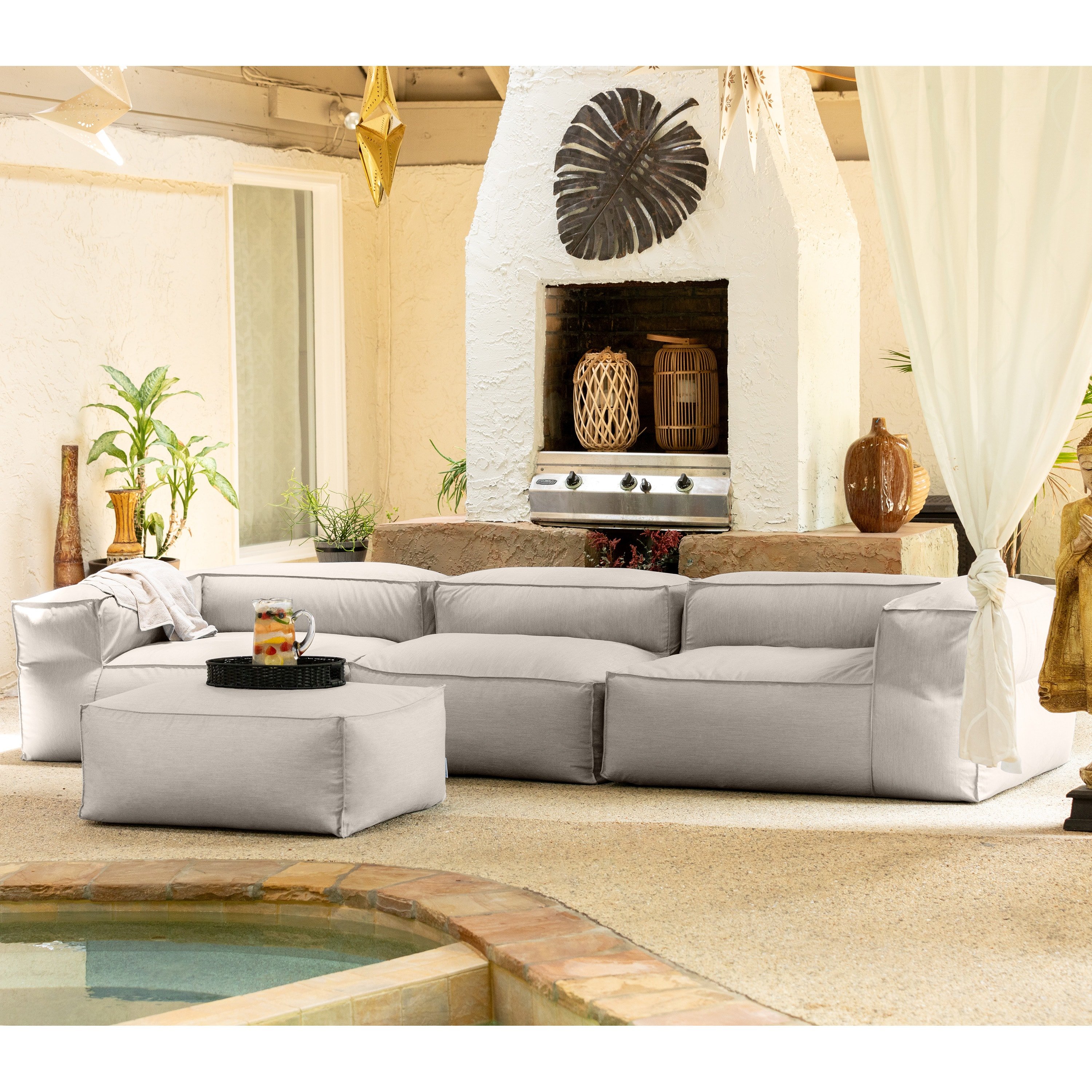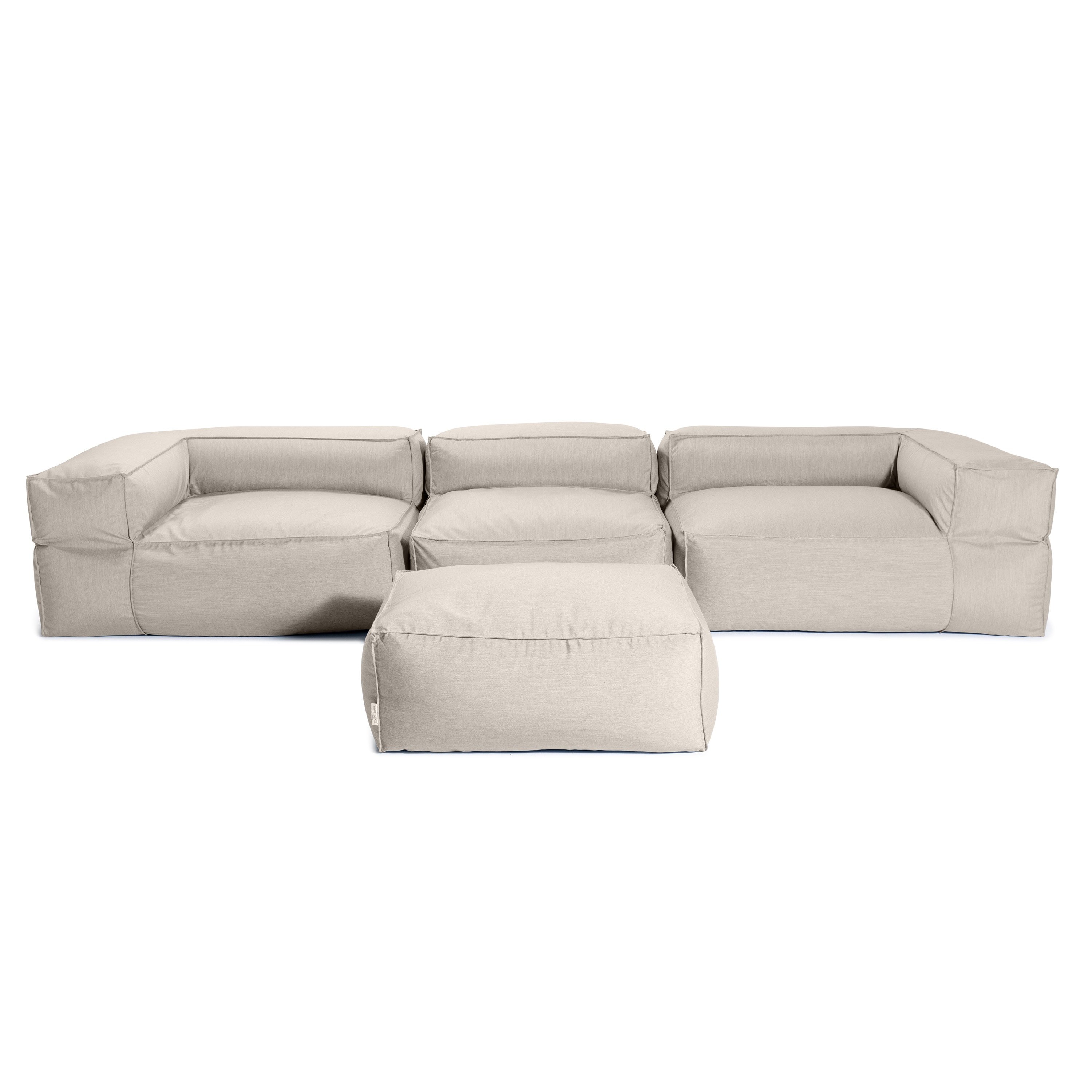 Our expansive, modular Baya Outdoor 3-piece Sofa and Ottoman is ideal for relaxing and entertaining on your patio or poolside. These versatile, luxurious editions to our bean bag range are made using the limited edition Sunbrella® Cast fabrics - perfect for modern interiors and durable enough to withstand outdoor living. The finely textured, heathered weave is resistant to dirt, mold, mildew, and UV rays and is designed to maintain its beauty with proper care and easy cleaning. The Baya 4-Piece Sofa and Ottoman includes the Baya Center Seat, left and right Baya Corner Seats, and a Baya Ottoman.