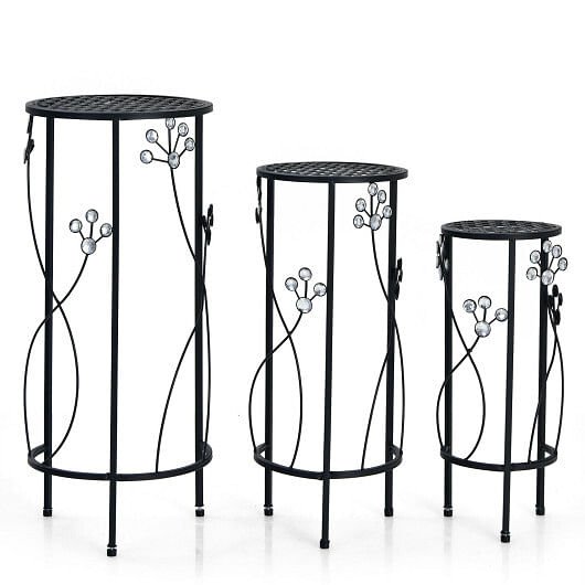 3 Pieces Metal Plant Stand Set with Crystal Floral Accents Round-Black