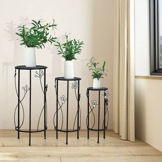 3 Pieces Metal Plant Stand Set with Crystal Floral Accents Round-Black 3 Pieces Metal Plant Stand Set with Crystal Floral Accents Round-Black 3 Pieces Metal Plant Stand Set with Crystal Floral Accents Round-Black
