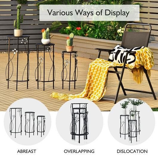 • With 3 plant stands of different sizes allowing for various ways of placing