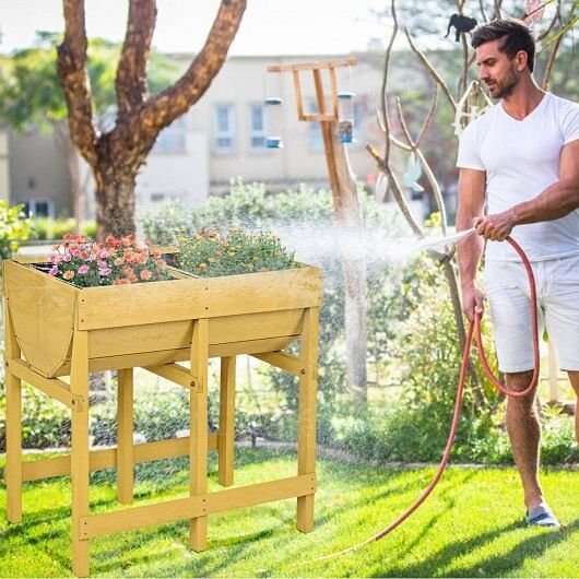 The planter made of wood has a natural look and is sturdy durable which can serve you for a long time. It has a fine design and is raised and standing which is easy for you to use. Designed in this way you can do the planting without bending down. It makes your gardening work easier and more comfortable.